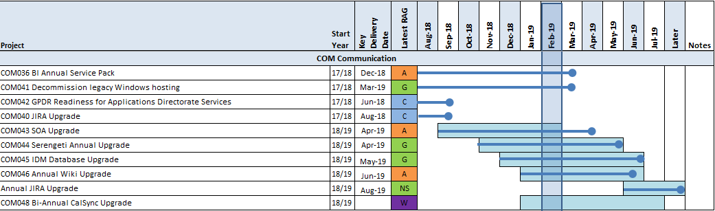 COM041 has had its final milestones pushed back by a few weeks as well as the final migrations are taking longer than anticipated. Similarly, COM043 has been going well, but the UAT sign-off, and the remaining milestones, have had to be revised because of delays in getting test data from partner areas. The go-live is now planned for late April.