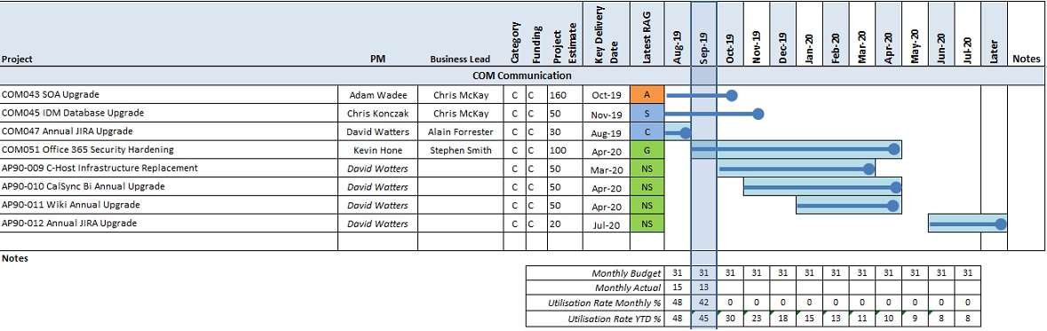 COM051 (Office 365 Security) has started in earnest with the PM putting together the project brief and working out, with input from Service Management and others, what needs to go into the project scope and how it can all be planned. Planning sign-off is expected in early October.
