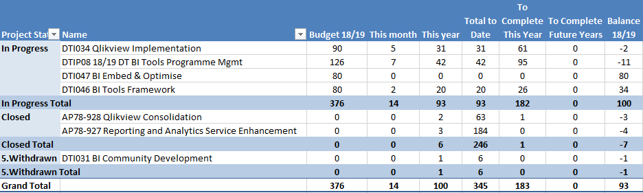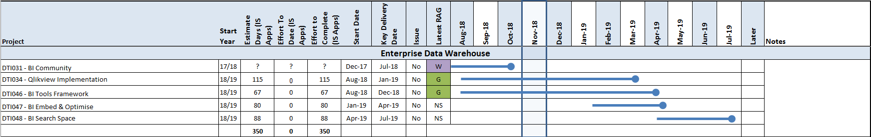 | DTI031 - Develop the BI Community | Withdrawn - will be met with an appropriate comms plan, a means of raising and responding to queries as outlined by Service Management for ongoing BAU, and regular sessions for key users to input into the ongoing development and maturing of our BI capability. | |