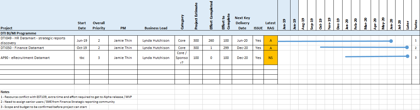 - Some of the BI team resources had to be assigned to the EST109 Estates Strategic Reporting project - to get that project over the line for start of UAT Phase 2