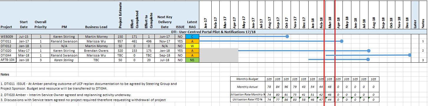 - DTI011 re-plan is now out for senior management review and will be presented to Steering Group on 18th April (delayed due to unavailability of steering group members for meeting planned on 30th March).