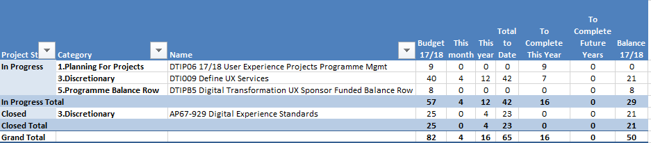 - DTI009 -The revised budget proposal has now been received and approved. Colan and Neil to work on the longer-term sustainability plan, e.g., via production of a proposal for ISG Planning Round funding (submitted through LTW) beyond the life of the User Experience programme to cover the period from 2019/20 onwards.