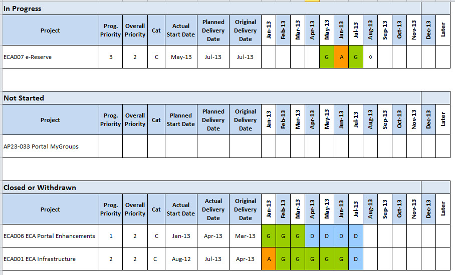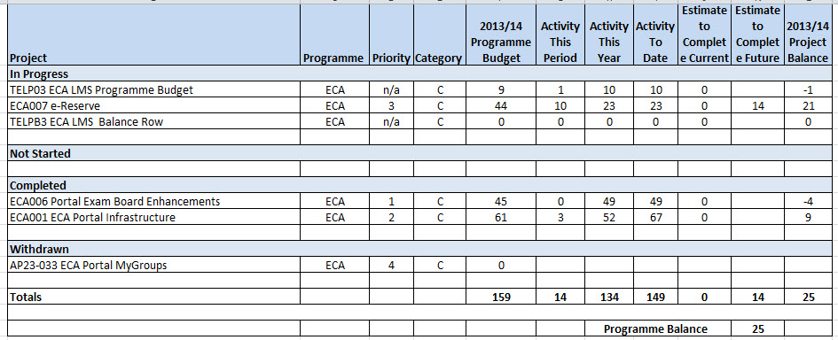 ECA007 e-Reserve has been started as in-year project, to address a serious audit issue the portal has with copyrighted material. The project had a delay due to ECA not yet ready to confirm their requirements and has rolled over into 2013/14, so will require budget from the ring-fenced ECA allocation to complete.