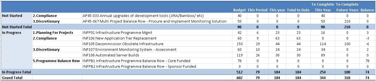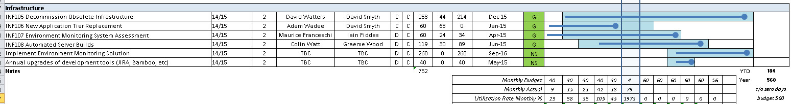 However, with the INF105 Decomisison Infrastructure project having taken almost six months to get to the end of planning, INF106 Automated Server Builds having slipped a month in planning, and INF107 Environment Monitoring Assessment stretching out to April to allow the assessment of more products, the programme manager has recommended decreasing the effort on the follow up to INF107 by 50 days and addign this effort for future years. There is still 78 days contingency available to the programme.