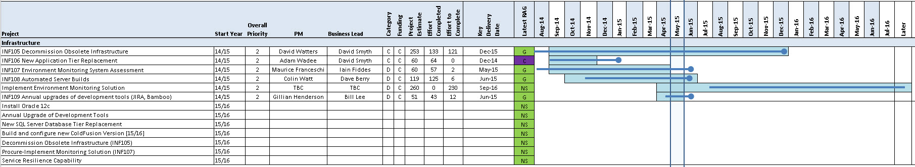 The project to follow on from INF107 is now expected to start in July, which is later than originally planned, so the 50 days for this will not be required - it will either not be needed and can be returedn to the ISG Portfolio or moved into 2015/16, depending on the Senior Management response to its recommendations.