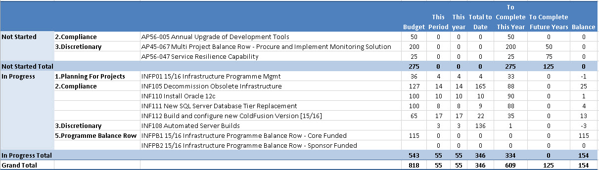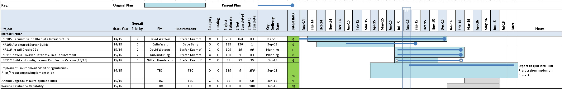All projects planned to deliver and complete last year year did, apart from INF108 which has just a very little effort carried over onto 2015/16 and is closing.
