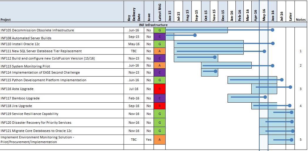 | INF105 (AP45-053) Decommission Obsolete Infrastructure Category: Core Funding Milestones RAG Status/ RAG change during last month Project status is GREEN. | Report by David Watters for May 2016Achievements this Period- Further monitoring of CF migrations - most completed; all now planned or under way