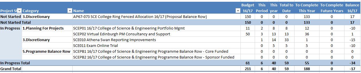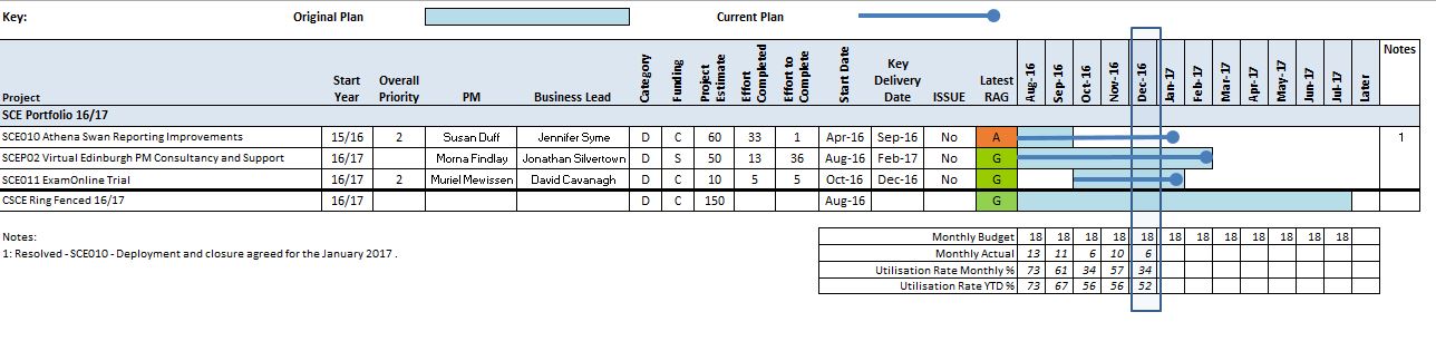 The CSCE Programme / Portfolio has a budget of 211 days for 2016/17 with 128 days still unassigned. Its overall status is AMBER. Please note that the project RAG status is following the guidelines available on the Project RAG status guidance page.