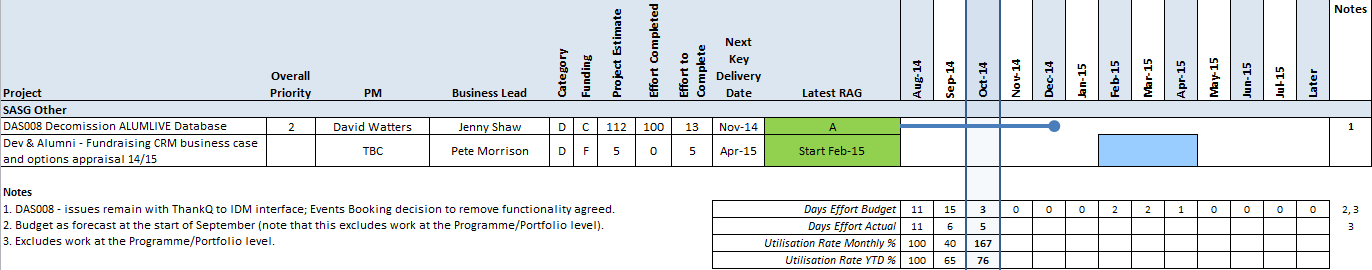Dev & Alumni - Fundraising CRM business case and options appraisal 14/15 Discretionary Planning February 2015 Delivery April 2015 RAG Status GREEN | Plan Development & Alumni will lead on the project, the IS Applications involvement is expected to be limited mainly to development resources in relation to estimation for any integration work that may be required. This is currently expected to be around 5d. Dependencies Development & Alumni starting the business case. Potential overlap with other CRM projects: HSS004 CRM for HSS Options Appraisal and New University-wide CRM. |