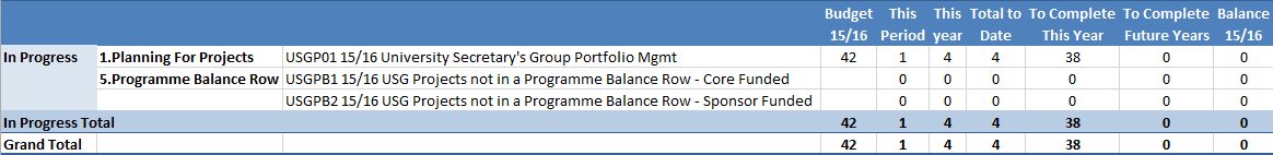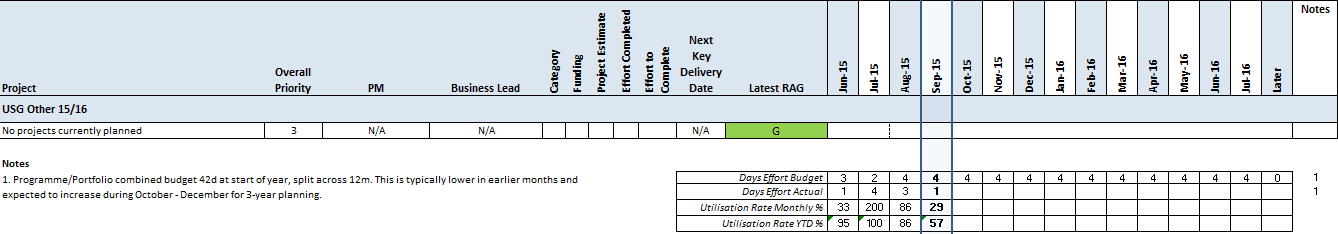 There are no projects currently planned in the Other USG programme for 15/16 and so the Resources table below shows effort at the USG Portfolio level only.