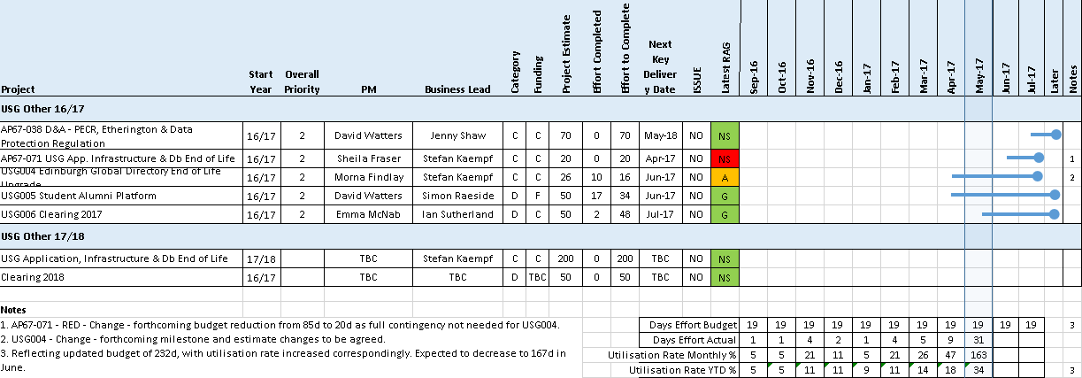 PlanThis project is to identify applications, databases and infrastructure which will come to the end of their working life in the next 3 years, and to plan upgrades, migrations or replacements accordingly. The status is RED as it is now clear that the only remaining work that must be delivered in 16/17 is the Edinburgh Global Directory updates, now initiated as USG005, and so the budget can be reduced accordingly (RED due to forthcoming budget reduction from 85d to 20d, with 6d will be transferred to USG005, 5d retained as contingency for USG005, and 15d allocated for php analysis). The analysis of those changes to be implemented for 17/18 will be started in parallel with USG005. There is work that will be needed early in 17/18, and the analysis should enable this to be identified and prioritised. Following initiation discussions on STU256 it is clear that the decision on the approach for php, including the UG & PG Degree Finders, is the next highest priority. 15d will be retained for this analysis, and combined with the 20d previously released from the STU budget for STU256, to enable initiation of what will be USG003 with an estimate of 35d. |