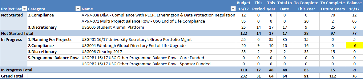 The D&A Compliance with PECR, Etherington and GDPR (USG002) initiation remains expected in July because the Information Commissioner's Office is still not yet able to answer whether the University will be considered a public body. The D&A team are working with other institutions to jointly petition the ICO for clarity. Risk12 has been raised in relation to the portfolio budget for 17/18 due to this delay.