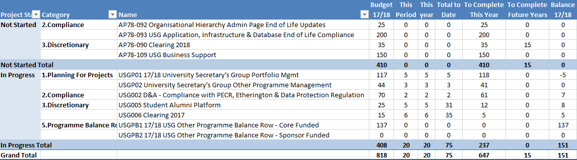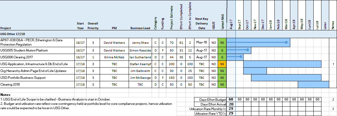 PlanThis project is to provide a basis of days on which a call-off can be made for areas of priority for USG, in a similar manner to that of the ring-fence for the Colleges. As such there is no immediate clarity on the scope, this is most likely to be a number of small pieces of business analysis, with potential follow-on work dependent on the outcomes of the analyses. This is GREEN as the work is expected to be small, and to fit in with other work as appropriate. DependenciesNone known. |