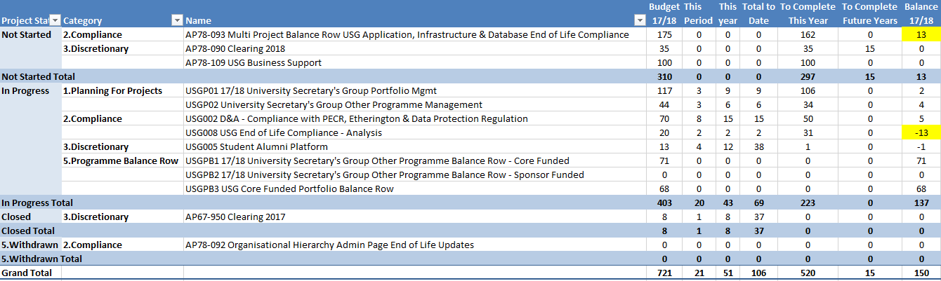 USG008 - this is currently in the planning phase and early indications of estimate are likely to be higher than the 20d currently allocated - this is being offset from the corresponding multi-project balance row as indicated by the yellow shaded cells below. The USGPB1 and USGPB3 balance rows are likely to be needed to fund the unplanned work for Records Management noted in Risk 15.