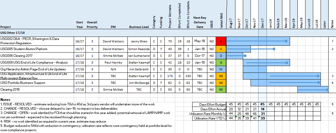 PlanThere is a need to identify applications, databases and infrastructure which will come to the end of their working life in the next 3 years, and to plan upgrades, migrations or replacements accordingly. This work has started in October for business analysis in USG008. A number of areas for further work have been identified, and discussion is being undertaken on how best to undertake these. These will be initiated on a call-off basis from this balance row where a need is identified for work in 17/18 during USG008. This is AMBER due to the change in allocation from 175d to 153d for USG008. It is also AMBER as there is a potential reduction in the estimate due to early indications of work required in 17/18. The expected work is related to the replacement of the FoI application and is dependent on a number of factors. Other work identified as being needed in 17/18 for the LAMP/WIMP infrastructure moves may now be undertaken in 19/20 and so is not required in this year, reducing the effort expected. DependenciesClarity on end of life position from Production Management for each component of the architecture. Discussion with Service Excellence regarding planning and timelines for USG applications in SEP scope. |