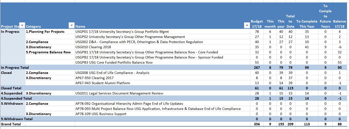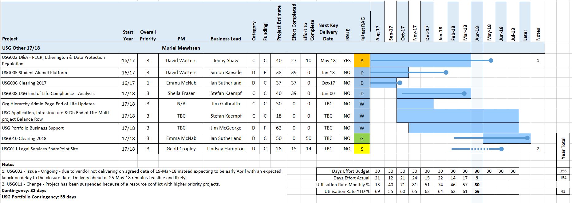 Overall the USG Other Programme is AMBER, with three active projects, one delayed by external supplier (USG002) and one suspended (USG011) due to internal resource conflict. The utilisation rate remains low due to the slow progress in USG002 and USG011 as mentioned. USG010 recently started and work is expected to increase in coming weeks. The contingency held within the USG Other Programme (32d as programme contingency and 55d as portfolio contingency) is expected to be released in support of compliance work in Human Resources.