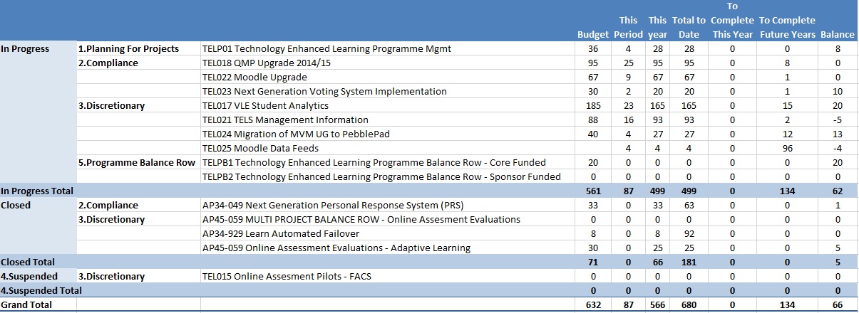 TEL015 (AP45-039) Online Assessment/Feedback Evaluations – FACS Milestones: RAG Status SUSPENDED | Report by Sue Woodger for April 2015 TEL015 suspended for 6 months until 1 October 2015. Next StepsEnd of Suspension 1 Oct 15 |