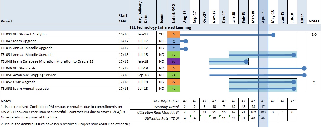 Project RAG status is currently AMBER due to PM resource conflict still ongoing and the need to repeat PM recruitment (new PM now confirmed to start 14/05/18). No escalation required at this time. |