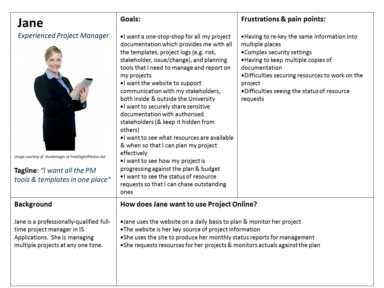 - Jane - the experienced project manager