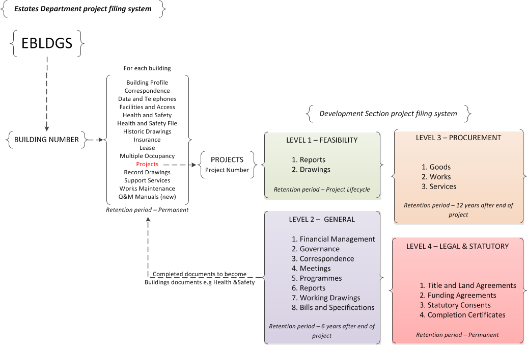The hierarchy of the Projects will be 5 levels with related documents stored within each level. These levels are: